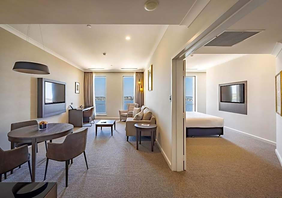 Overlooking the Swan River, this suite has one bedroom, separate living and dining areas, powder room, spa bath and separate shower. This room offers buffet breakfast, evening drinks and light tapas and complimentary mini bar, coffee machine, limousine transfers, fruit bowl, 4 pressed laundry.